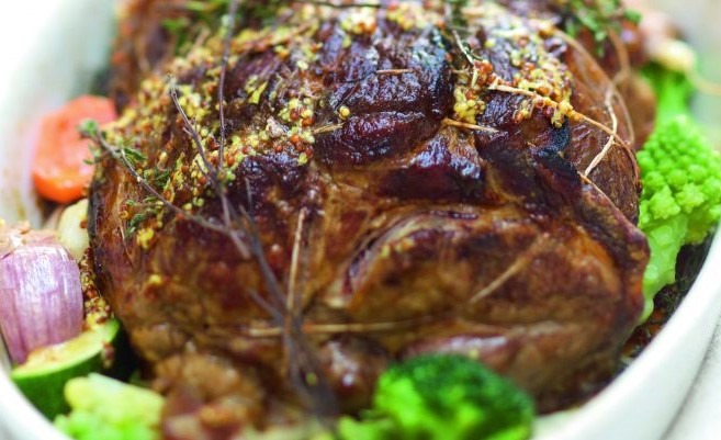 Badigeonnez le rôti de moutarde et de miel.