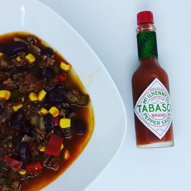 Ingrédients pour 6 personnes : 600 g de bœuf haché – 2 oignons – 3 gousses d’ail – 1 grosse boite d’haricots rouges – 1 grosse boite de pulpe de tomates – 1 petite boite de maïs – 1 poivron vert – 3 c. à soupe d’huile de tournesol – 1 cube de bouillon de Boeuf – Tabasco – Poivre.