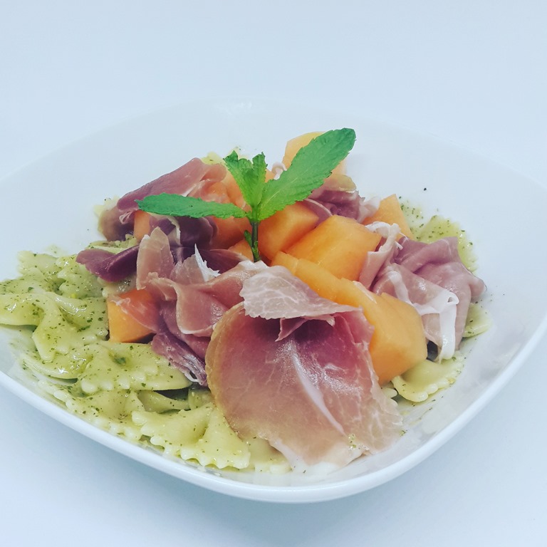 Ingrédients pour 4 personnes  : 375 g de farfalle  –  1/2 botte de menthe – 50 g de pignons de pin – 10 cl d’huile d’olive –  1 melon –  4 tranches de Jambon de Parme – Sel, poivre.