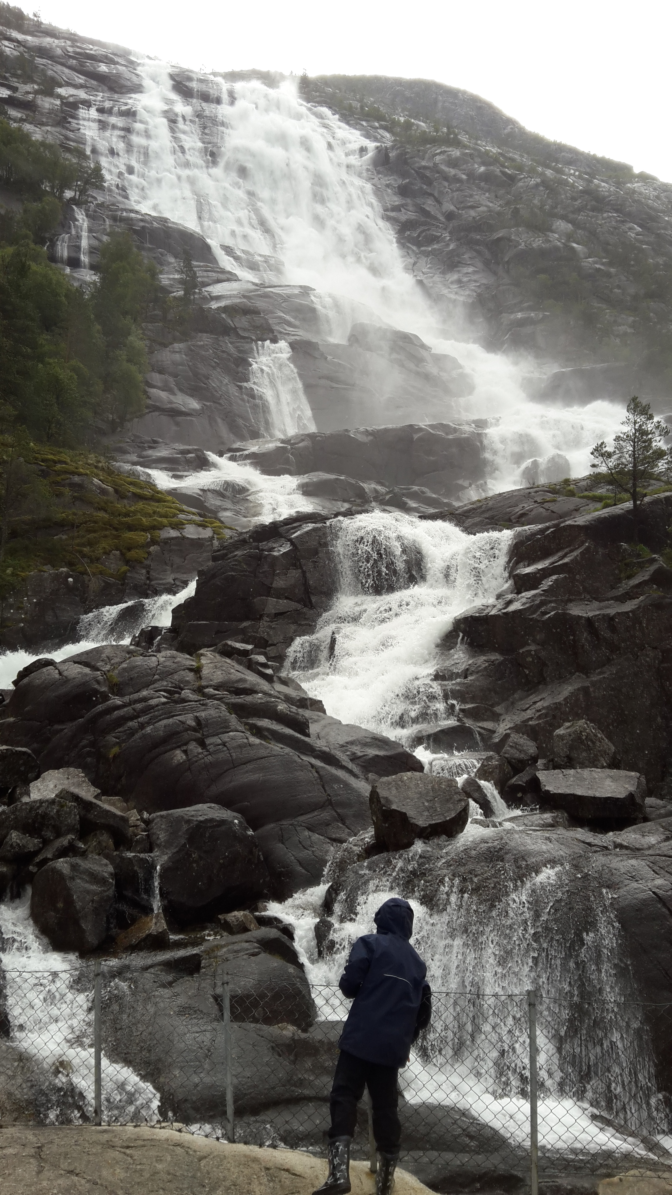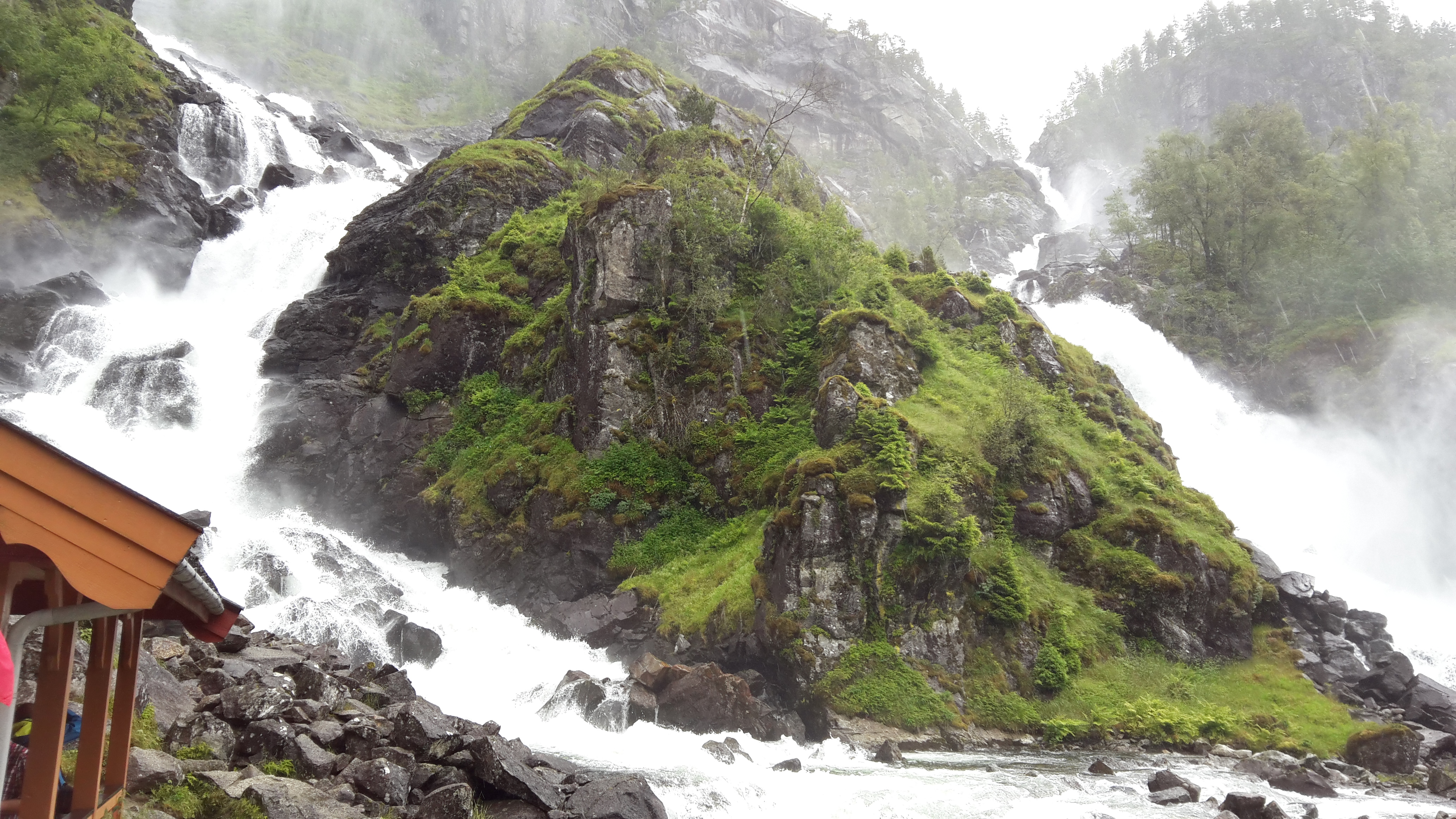 Avant d’y arriver et malgré la pluie nous avons fait des arrêts pour voir deux cascades impressionnantes (langfoss 612 m  et latefossbru 165 m). beaucoup d’eau  comme si nous n’en n’avions  pas assez !