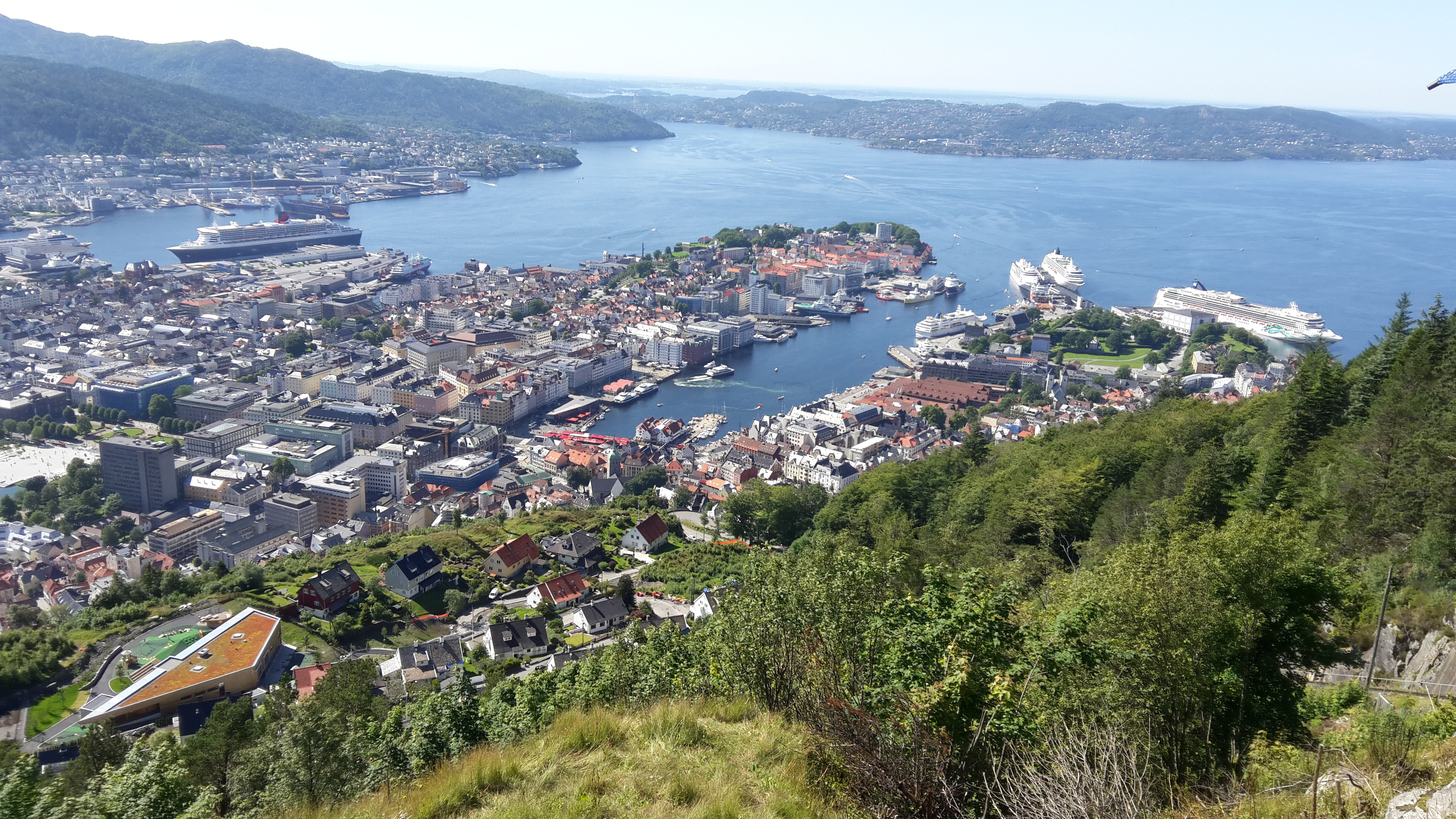 c est parti pour l’ascension du jour …le Fløibanen , la colline qui domine Bergen de ses 325 m permet une belle balade dans les quartiers au dessus du port avant d attaquer la forêt (pour les moins courageux un funiculaire y montent en 15 minutes) avec une pente à 26 degrés. Donc après 1 heure de marche on arrive à une plate-forme point de départ d autres randonnées et des activités pour les enfants.