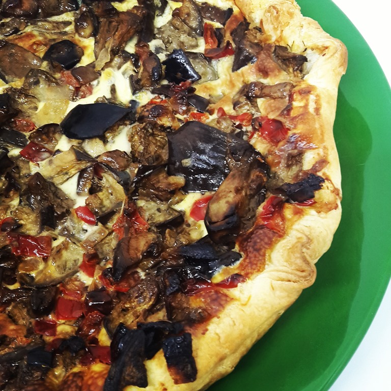 Ingrédients pour 6 personnes : 2 aubergines bio – 1 poivron rouge bio – 1 oignon – 3 œufs – 150 g de feta – 15 cl de crème liquide – 1 pâte feuilletée – 2 c. à soupe d’huile d’olive – 1 c. à café d’origan séché – Sel et poivre.
