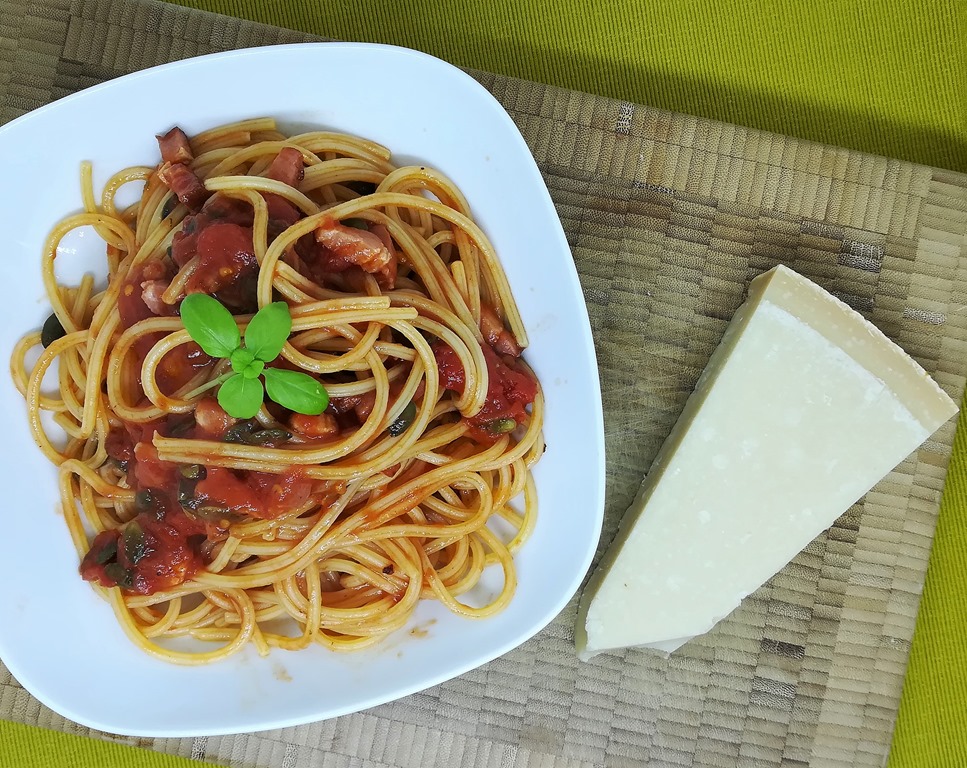Ingrédients pour 2 personnes : 200 g de spaghettis – 75 g d’allumettes de bacon – 2 c. à soupe de graines de courge – 15 tomates cerises bio – 1 cube de bouillon de légumes bio – huile d’olive – parmesan.