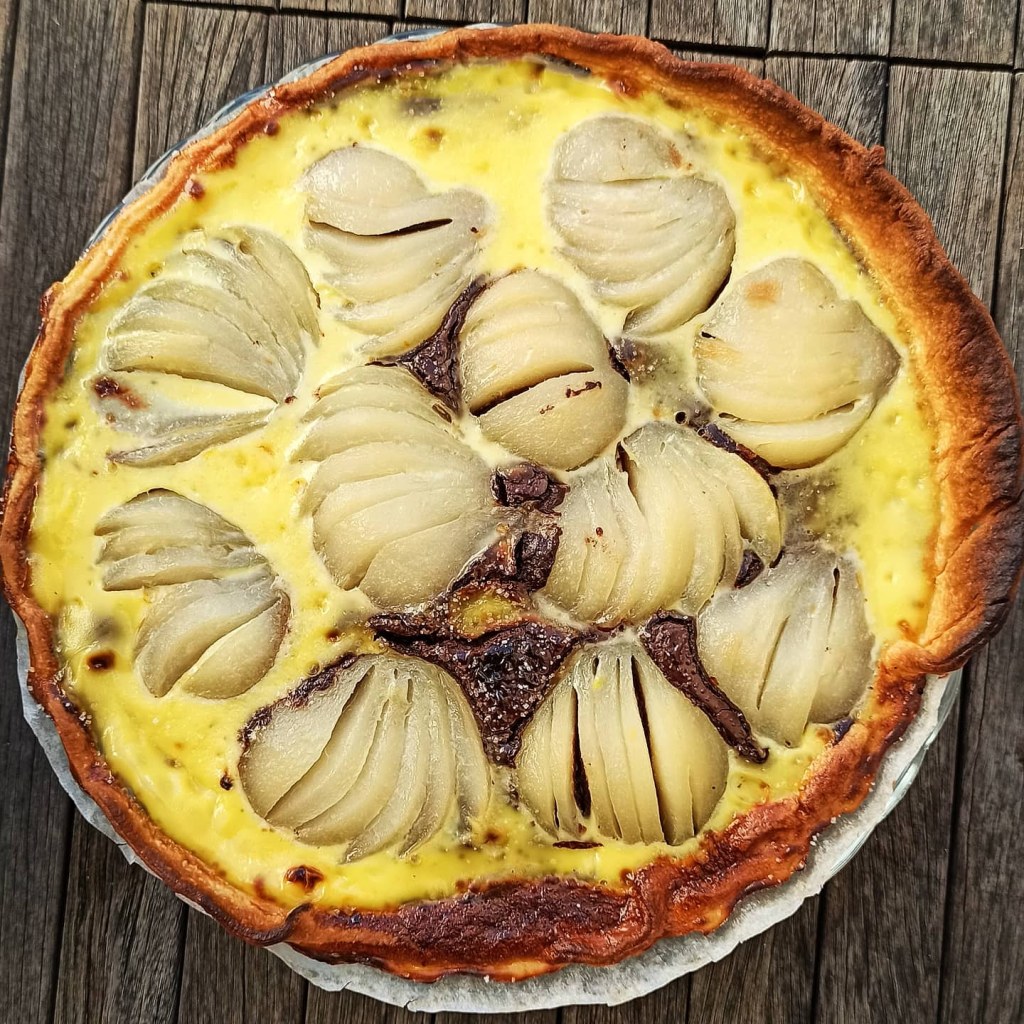 Ingrédients pour 6 personnes : 1 pâte sablée – 120 g de chocolat noir – 1 grosse boite de poires au sirop – 2 oeufs – 75 g de sucre semoule -15 cl de crème liquide – 15 cl de lait – 1 c. à soupe de sucre glace.