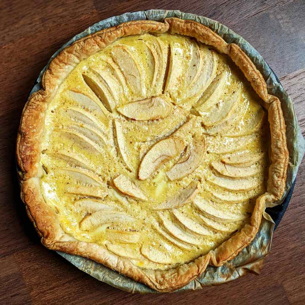 Ingrédients pour 6 personnes : 1 rouleau de pâte brisée – 4 pommes – 2 oeufs – 100 g de sucre semoule – 1/2 c. à café rase de cannelle en poudre – 20 cl de crème épaisse – 15 cl de lait entier.