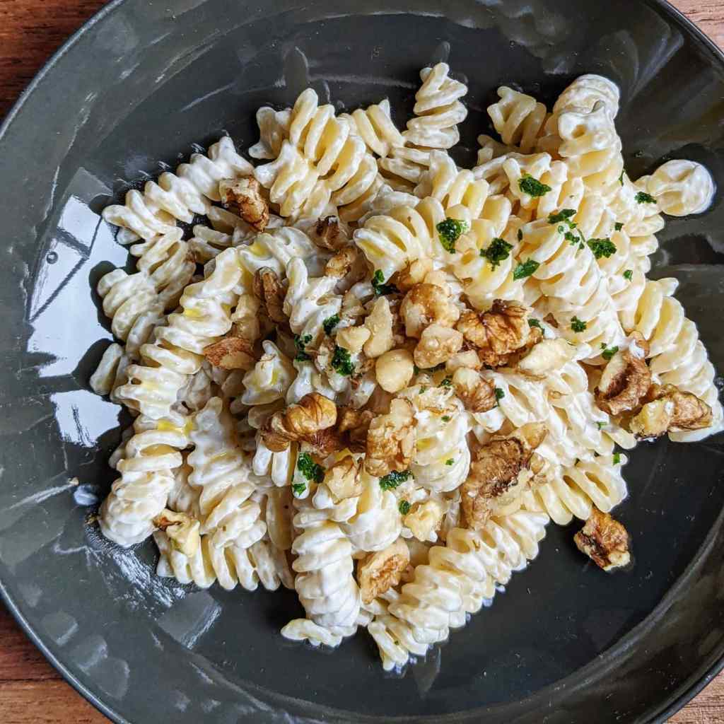 Ingrédients pour 2 personnes : 300 g de fusilli – 60 g de cerneaux de noix – 1 petit bouquet de persil – 200 g de fromage frais de chèvre à tartiner – 2 c. à soupe d’huile d’olive ou de noix – Sel, poivre.