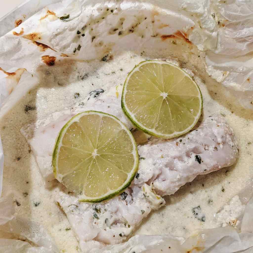 Ingrédients pour 4 personnes : 4 filets de colin – 8 brins de menthe fraîche – 30 cl de crème fraiche épaisse – 1 citron vert – 1 pincée de piment doux – 4 c. à s. d’huile d’olive – Sel, poivre.