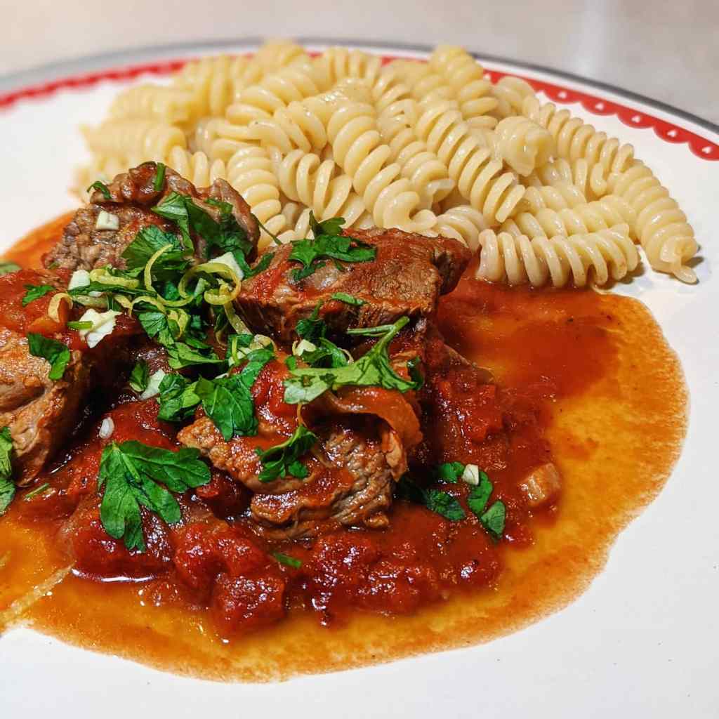 C’est un plat qui mijote doucement et qui bien sûr s’accompagne de pasta, en saison il sera encore meilleur avec un coulis de tomates maison , même si on trouve d’excellent coulis bio et italien dans les supermarchés…