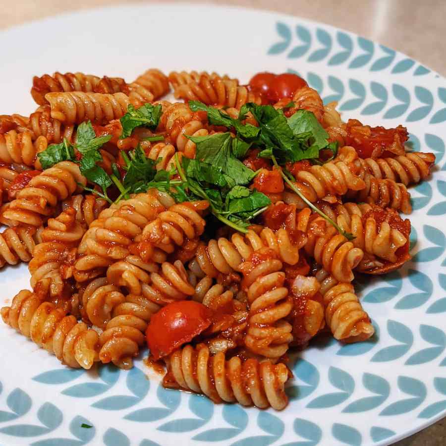 Ingrédients pour 4 personnes : 400 g de fusillis – 400 g de tomates cerises en grappes – 1 botte de persil – 300 g d’espadon ou thon – 10 cl de vin blanc – 20 cl de coulis de tomates – 2 à 3 pincées de piment d’Espelette – 1 c. à soupe d’huile d’olive – 1 gousse d’ail – Sel.