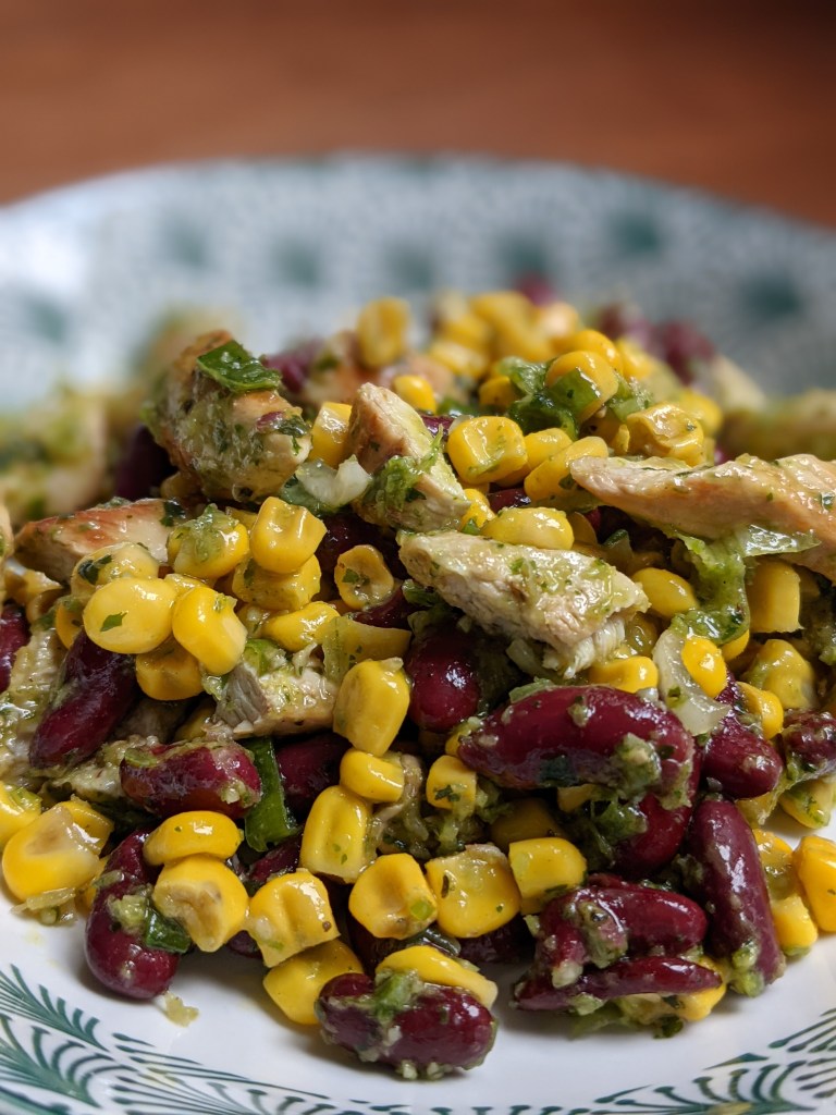 Ingrédients pour 4 personnes : 250 g de blancs de poulet – 2 c. à soupe d’huile d’olive – 1 oignon vert – 2 branches de coriandre – 250 g de maïs égoutté – 250 g de haricots rouges cuits – Sel, poivre.