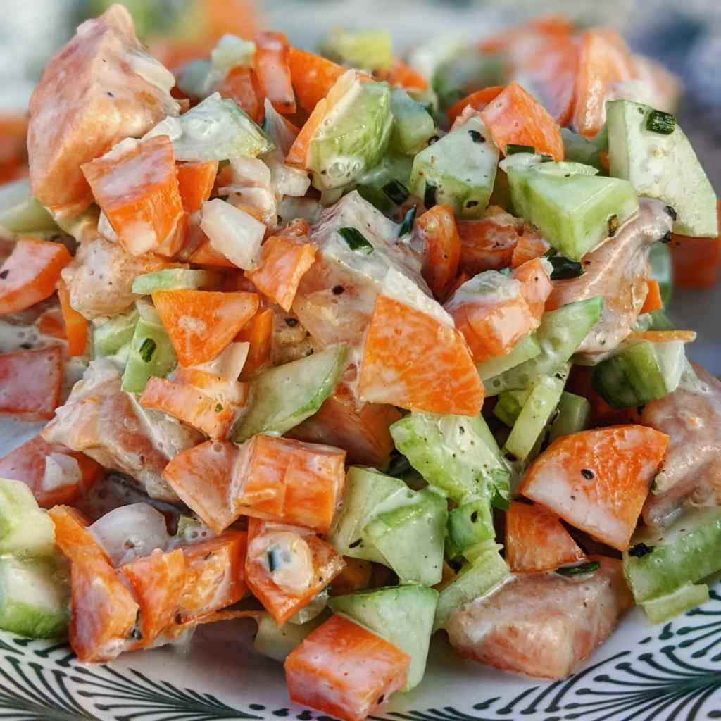 Placez tous les ingrédients dans un saladier, mélangez bien. Parsemez d’oignon vert ciselé et de persil. Servez rapidement.