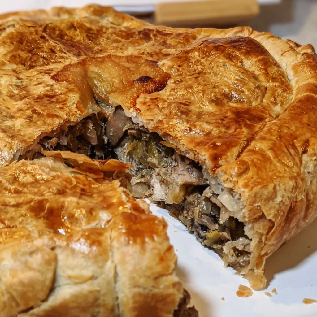 Ingrédients pour 6 personnes : 500 g de filets de poulet – 2 rouleaux de pâte feuilletée – 400 g de champignons de Paris – 2 poireaux – 1 oignon. – 2 oeufs – 3 c. à soupe de vin blanc – 2 c. à soupe de noisettes décortiquées – 3 brins de thym – 1 c. à café de 4-épices – Sel, poivre.