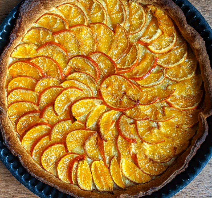 Ingrédients pour 6 personnes : 1 pâte sablée – 6 clémentines bio – 25 g de beurre – 1 cuillère à soupe de cassonade.
