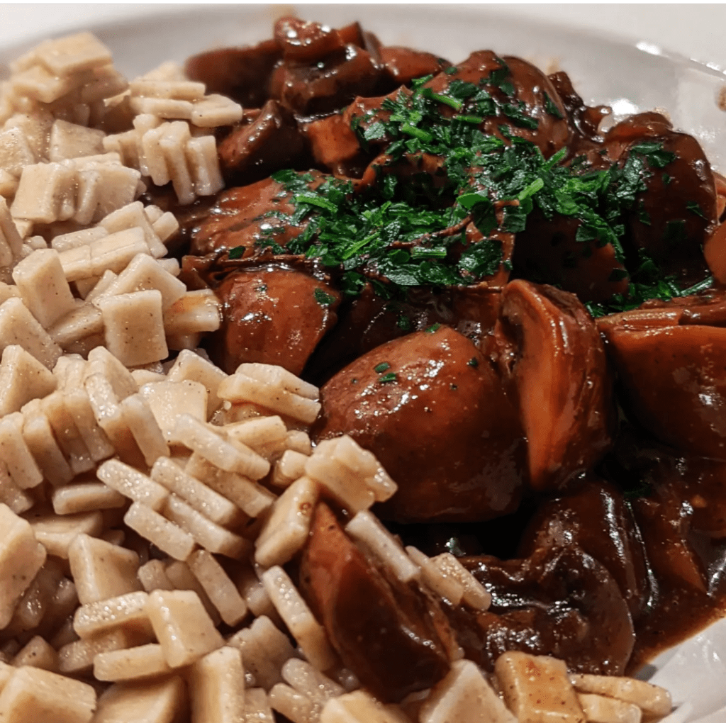 Cette carbonade aux champignons accompagnera parfaitement une viande blanche, nous avions choisi des crozets (pâtes de Savoie) pour un repas 100 % veggie.
