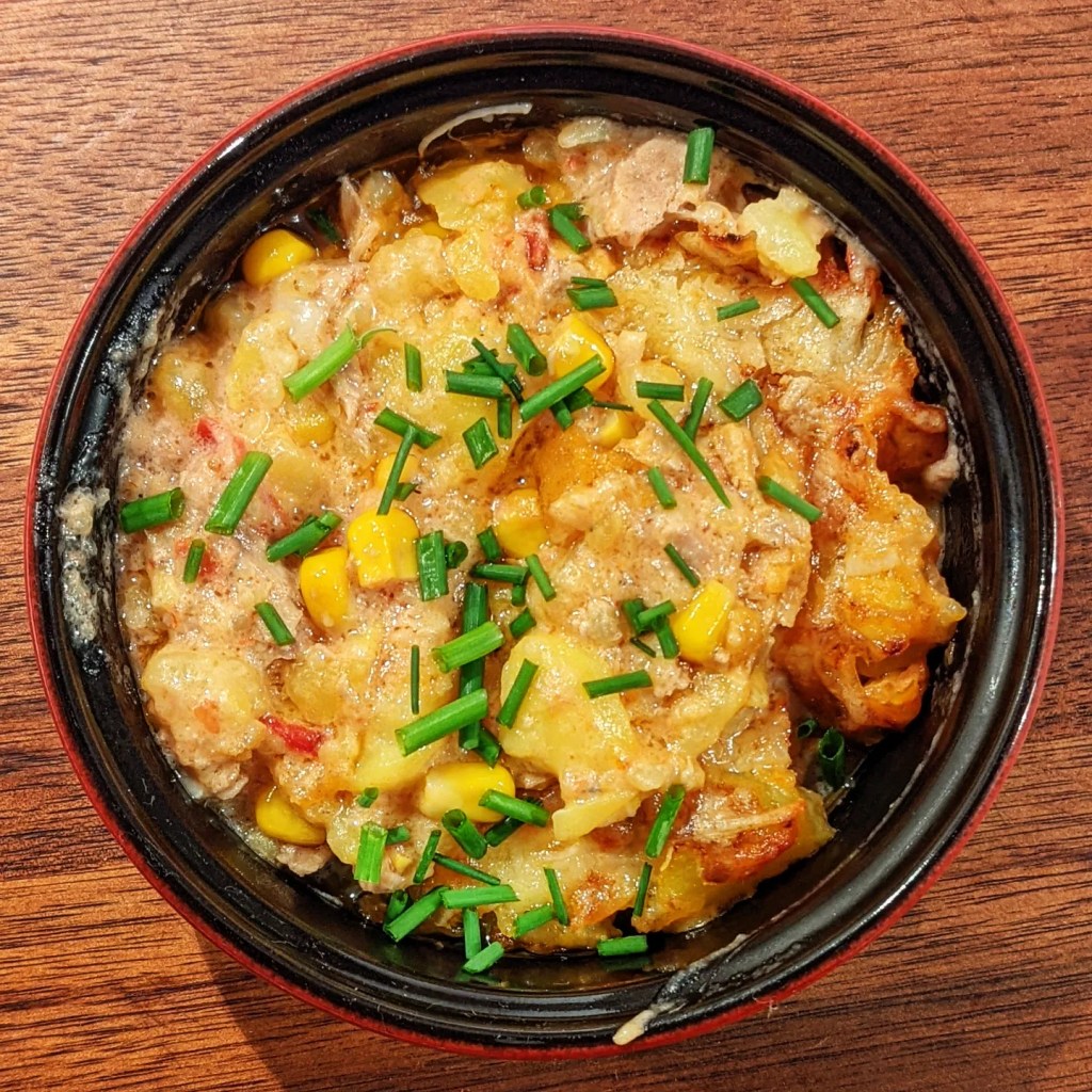Ingrédients pour 4 personnes : 600 g de pommes de terre – 300 g de thon à l’huile – 150 g de tomates concassées en conserve – 150 g de maïs en conserve 2 gousses d’ail – 1/2 botte de ciboulette – 15 cl de crème liquide – 10 cl de lait – 25 g de beurre – 100 g de fromage râpé – Sel, poivre.