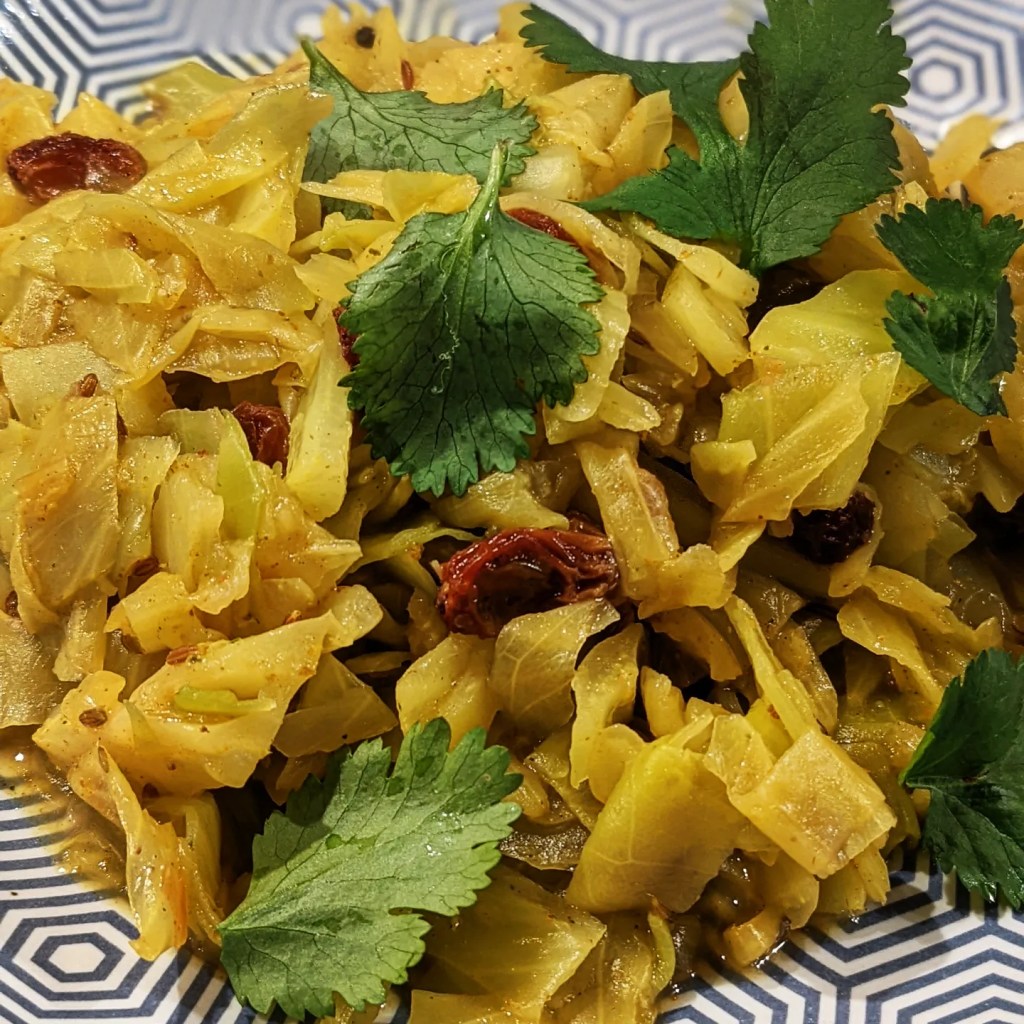 Ingrédients pour 4 personnes : 1 chou blanc – 1 cuil. à soupe de graines de cumin – 5 cl d’huile d’olive – 1 oignon – 2 cuil. à soupe de curry – 5 cm de gingembre frais – 1 gousse d’ail – 30 g de raisins secs – 2 cuil. à soupe de coriandre fraiche – 20 cl de bouillon de légumes – Sel et poivre du moulin.