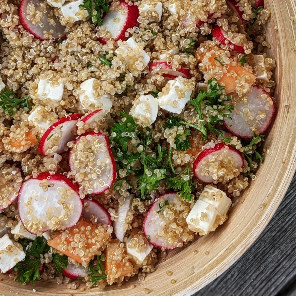 Ingrédients pour 4 personnes : 200 g de quinoa – 15 radis rouges – 1 oignon rouge – 1 tranche de melon – 100 g de feta – 2 cuillère à soupe d’huile d’olive – 2 cuillère à soupe de balsamique blanc -5 brins de persil – Sel et poivre.