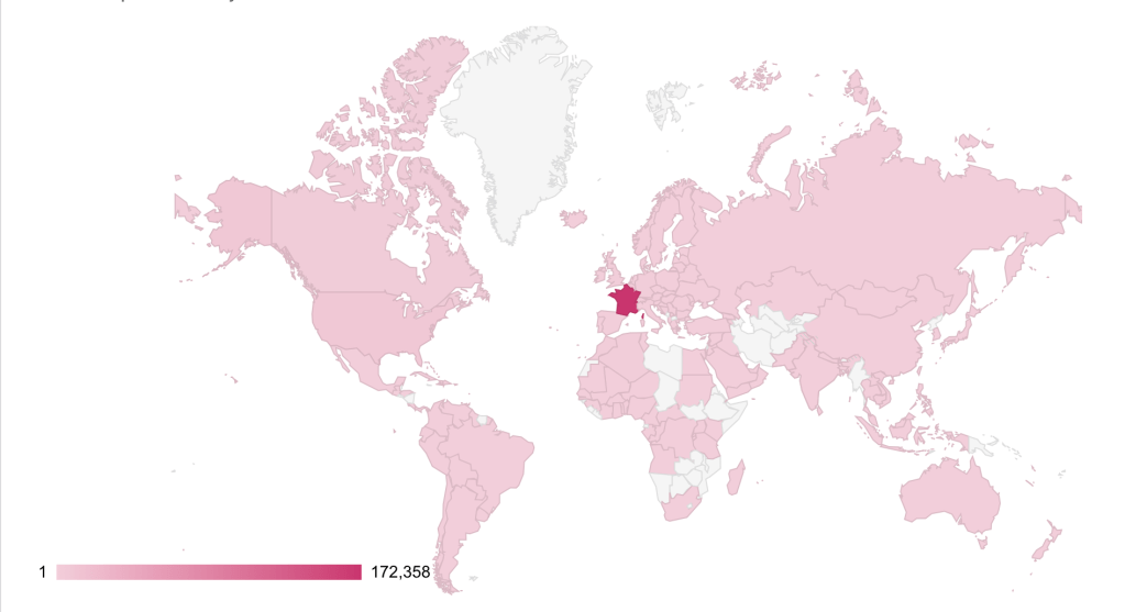 Si ce blog invite au voyage, c’est aussi une étape pour des visiteurs du monde entier qui s’arrêtent quelques minutes pour regarder une recette ou une photo (tous les pays en rose sont les visiteurs de l’année) … ce modeste blog qui depuis 16 ans n’a qu’une mission le partage, est donc parti pour une 17 eme année (ça serait cool d’arriver au 20 ans quand même !!!). La semaine prochaine je vous communiquerai les 20 recettes les plus vues sur le blog depuis sa création (ça sent déjà le best of de fin d’année)….