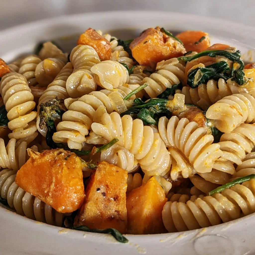 Ingrédients pour 4 personnes : 400 g de fusilli – 500 g de potimarron bio – 100 g de fromage de chèvre frais – 10 cl de crème fraiche – 150 g de pousses d’épinard – 1 échalote – 1 brin de thym frais – Huile d’olive – Sel, poivre.