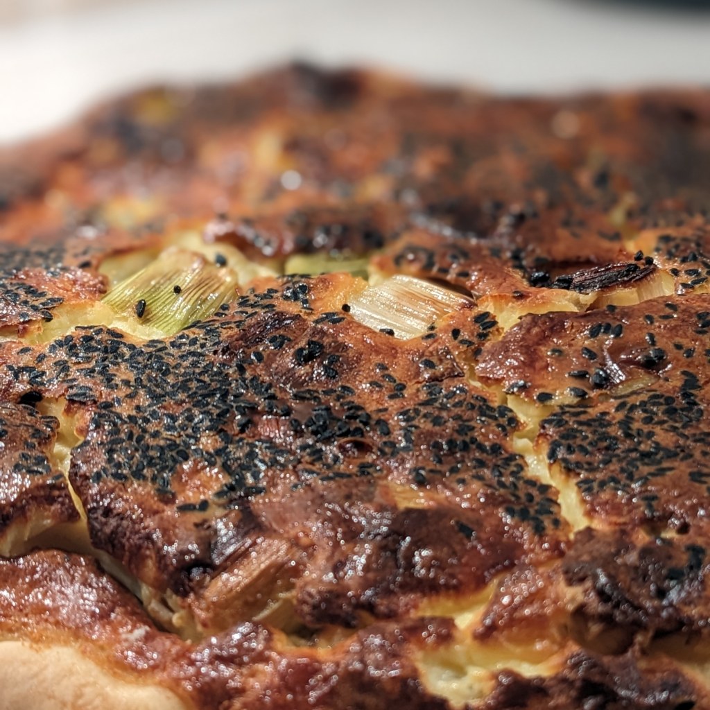 Ingrédients pour 6 personnes : 1 pâte brisée – 2 poireaux – 1 bûche de chèvre – 2 c. à soupe de graines de Nigelle – 40 cl de crème fraiche épaisse – 4 oeufs – 12,5 cl de lait – 75 g d’emmental râpé – Sel, poivre.