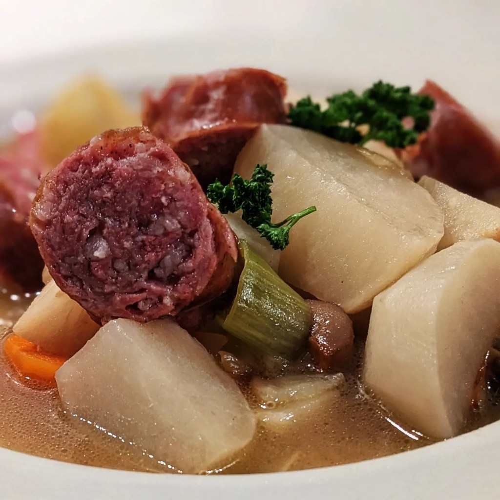 Ingrédients pour 6 personnes : 6 pommes de terre – 250 de petits champignons bruns – 1/2 céleri rave – 3 navets – 1 poireau – 2 carottes – 1 oignon – 2 gousses d’ail – 8 brins de persil – 75 g de beurre – 3 c. à soupe de farine – 1 c. à soupe d’huile de tournesol -Sel, poivre. 2 saucisses de Morteau (facultatif)