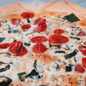 Répartissez par-dessus la feta, la courgette et les tomates. Saupoudrez du reste de thym.