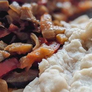 Ingrédients pour 4 personnes : 250 g de haricots blancs – 2 aubergines – 2 oignons – 3 tomates – 1 poivron jaune – 1 poivron vert – Huile d’olive – 20 g de cassonade – 15 olives vertes – 5 gousses d’ail – le jus de 1/2 citron