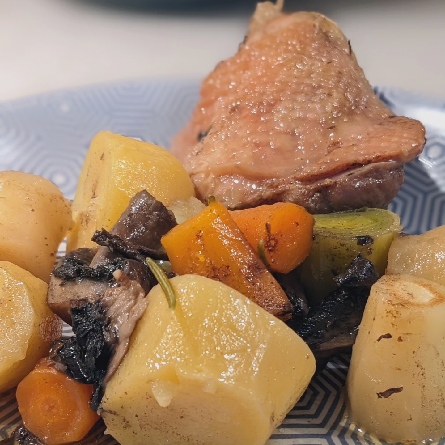 Ingrédients pour 4 personnes : 2 belles cuisses de poulet fermier – 3 panais – 4 carottes – 1 gros blanc de poireau – 4 pommes de terre – 150 g de champignons de Paris – 2 branches de romarin – 4 gousses d’ail – 20 g de beurre – 1 citron confit – 10 cl d’huile d’olive – Sel et poivre.