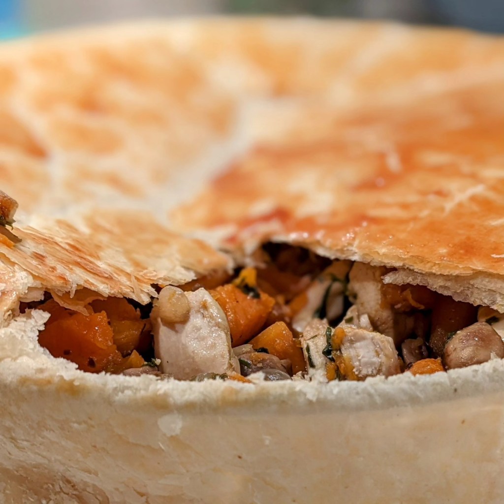 Ingrédients pour 4 personnes : 600 g de potiron – 3 blancs de poulet – 400 de champignons de Paris – 1 oignon – 1/2 bouquet de persil – 1 pâte feuilletée – 1 œuf – 10 g de beurre – 2 c. à soupe d’huile d’olive – sel, poivre.