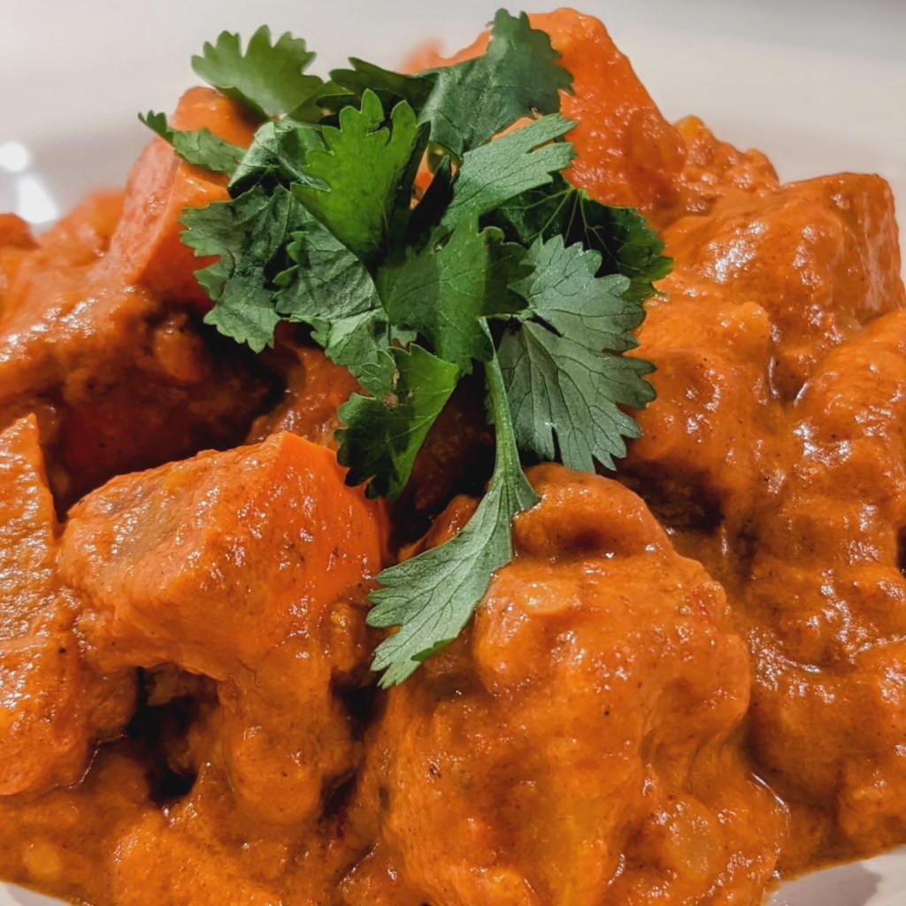 Ingrédients pour 6 personnes : 1 petit potimarron d’environ 1 kg – 1 oignon – 1 gousse d’ail – 4 brins de coriandre – 30 cl de lait de coco – 100 g de lentilles corail – 1 grosse boite de tomates concassées – 3 c. à soupe d’huile d’olive – 1 c. à soupe de double concentré de tomate – 1 c. à soupe de cumin moulu – 1 c. à soupe de cardamome moulue – 1 c. à soupe de coriandre en poudre – 1 c. à café de paprika fumé – Sel et poivre.