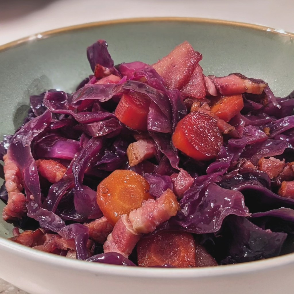 Ingrédients pour 4 personnes : 1 choux rouge – 300 g de lardons – 2 pommes – 1 gousse d’ail – 1 échalote – Curry en poudre – Poire, sel – Sauce Soja.
