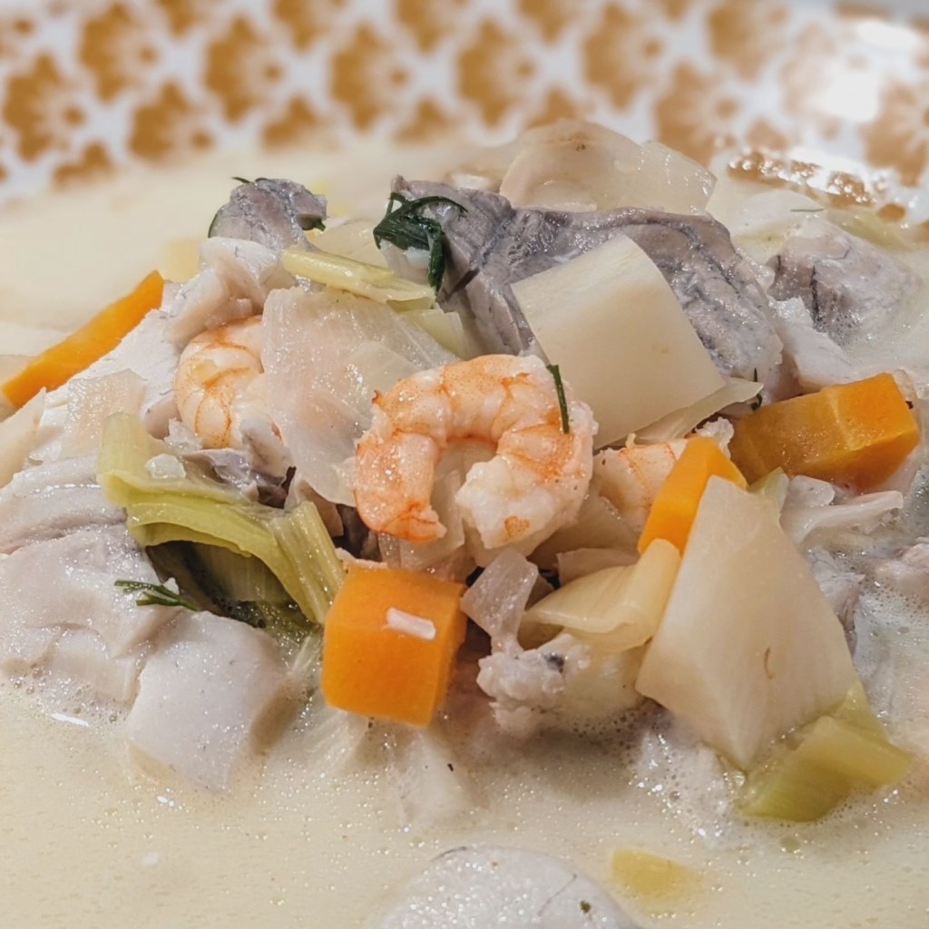 Ingrédients pour 4 personnes : 500 g de poissons (saumon, lieu noir, flétan) – 100 g de crevettes roses décortiquées – 15 cl de crème liquide – 40 g de beurre – 1 carotte – 1 oignon – 1 blanc de poireau – 150 g de céleri-rave – 1 l de fumet de poisson -5 brins d’aneth – 10 brins de ciboulette.