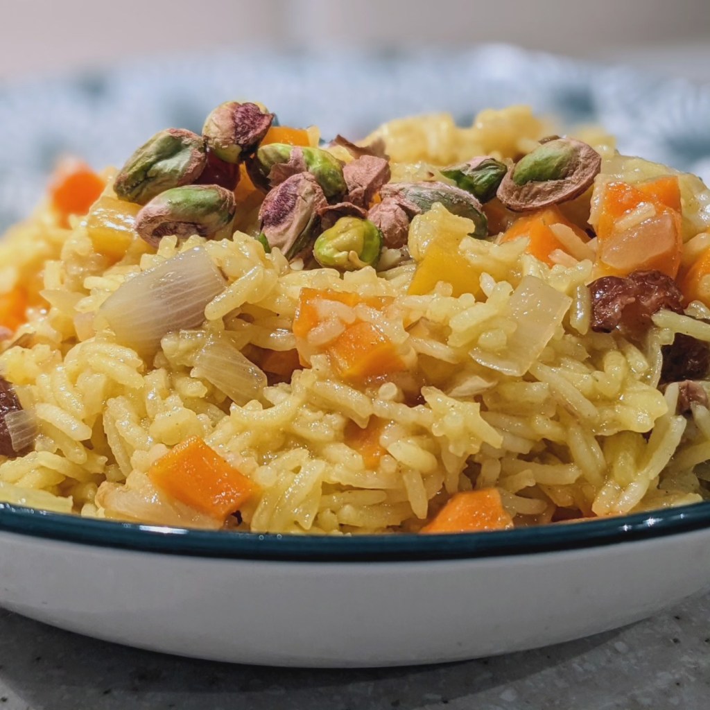 Ingrédients pour 6 personnes : 350 g de riz basmati – 3 carottes – 2 oignons – 40 g de beurre – 60 g de raisins secs – 60 g de pistaches non salées – 2 c. à soupe de sucre – 10 stigmates de safran – 1 cube de bouillon de légumes – Sel et poivre.