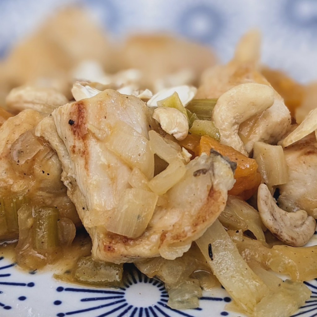 Ingrédients pour 4 personnes : 4 filets de poulet – 1 oignon – 50 g de petits pois – 1 jus de citron – Quelques brins de thym – 50 g d’abricots secs – 50 g de noix de cajou – 6 c. à soupe d’huile d’olive – 1 c. à soupe de miel – 1 c. à café de cumin – 1/2 c. à café de sel – 1/2 c. à café de poivre – 1 pincée de cannelle moulue.