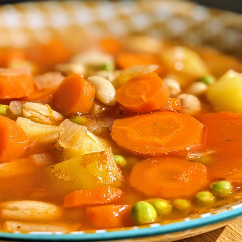 Ingrédients pour 6 personnes : 2 pommes de terre – 2 belles carottes – 100 g de petits pois – 1 oignon blanc – 1 bouquet de thym – 2 l de bouillon – 1 baguette – 200 g de tomates pelées en conserve – 100 g de haricots cuits – Huile d’olive – Sel et poivre.