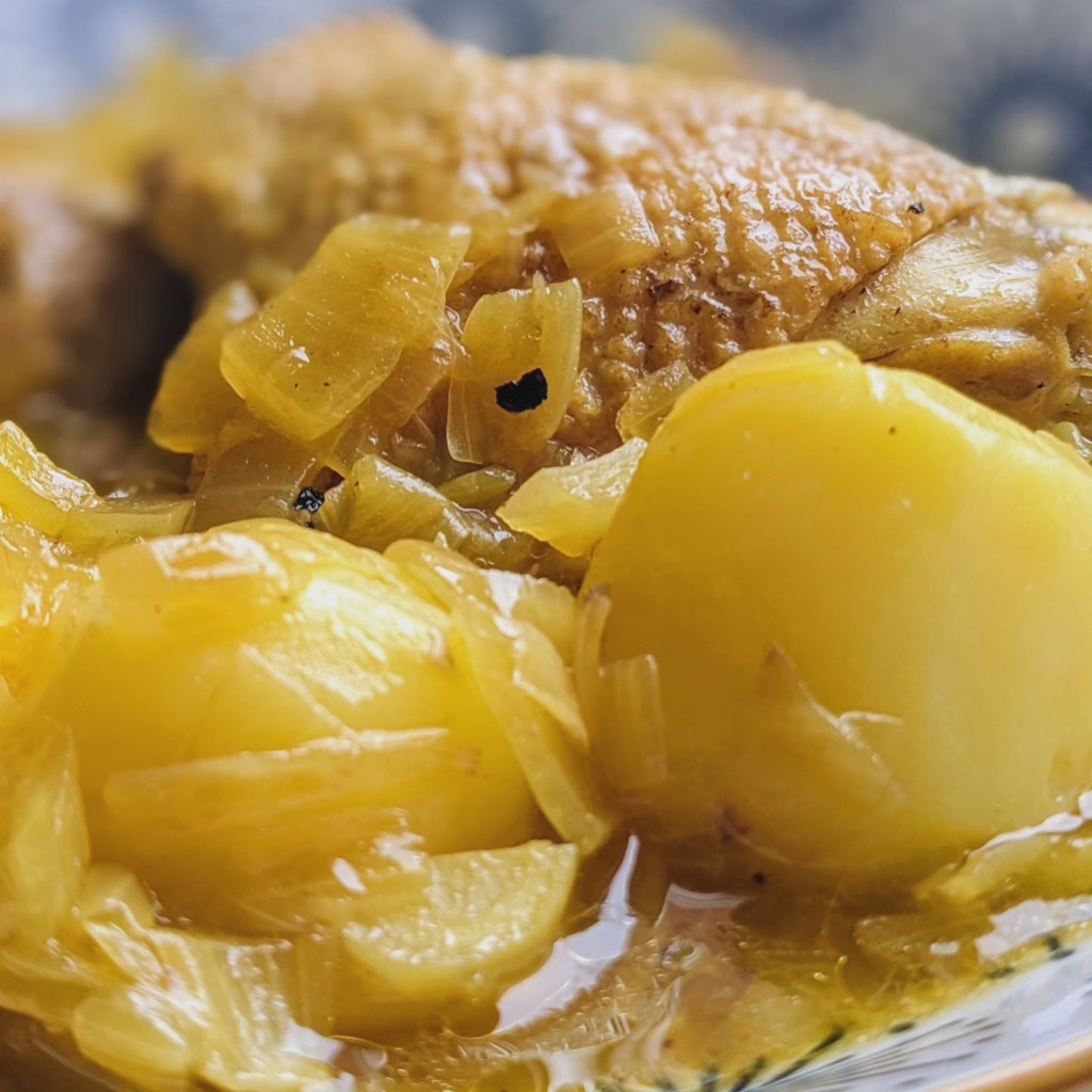 Ingrédients pour6 personnes : 6 cuisses de poulet – 6 oignons moyens – 2 c. à soupe de farine – 2 l d’eau – 1 verre à vin de pastis – 1 dose de safran par personne – 1 gros bulbe de fenouil – feuille de laurier – 1 filet d’huile d’olive- Sel et poivre.