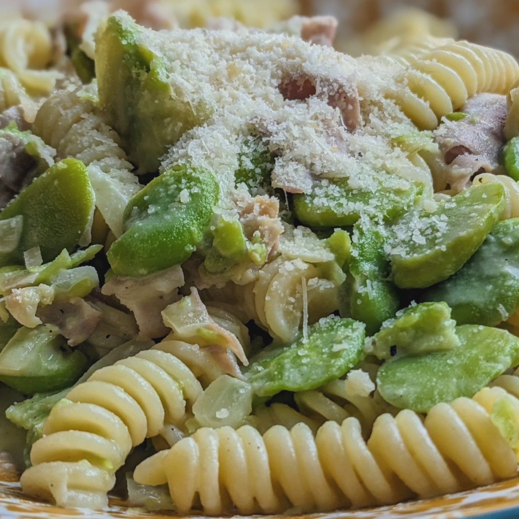 Ingrédients pour 4 personnes : 400 g de fèves écossées – 100 g de pancetta – 2 c. à soupe de crème fraiche – 400 g de pâtes – 1 oignon rouge – Sel et poivre.