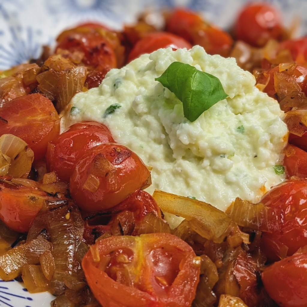 Ingrédients pour 2 personnes : 250 de mozzarella – 2 brins de basilic – 3 cl d’huile d’olive – 2 oignons – 1 gousse d’ail – 16 tomates cerise – Sel, poivre.