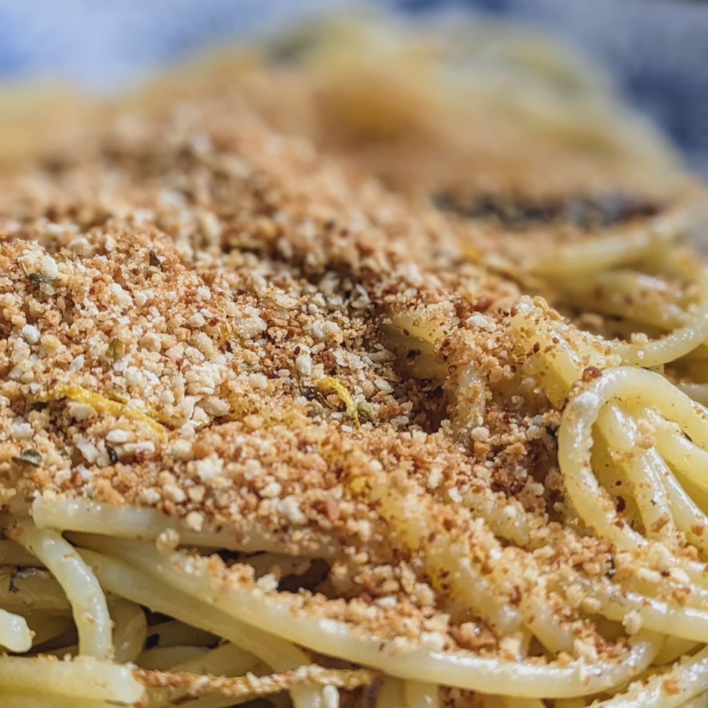 Ingrédients pour 4 personnes : 50 g de filets d’anchois à l’huile – 320 g de spaghettis – 250 g de chapelure fine – 2 pincées d’origan sec – 1 citron bio – 2 gousses d’ail pelées – 4 c. à soupe d’huile d’olive extra vierge.