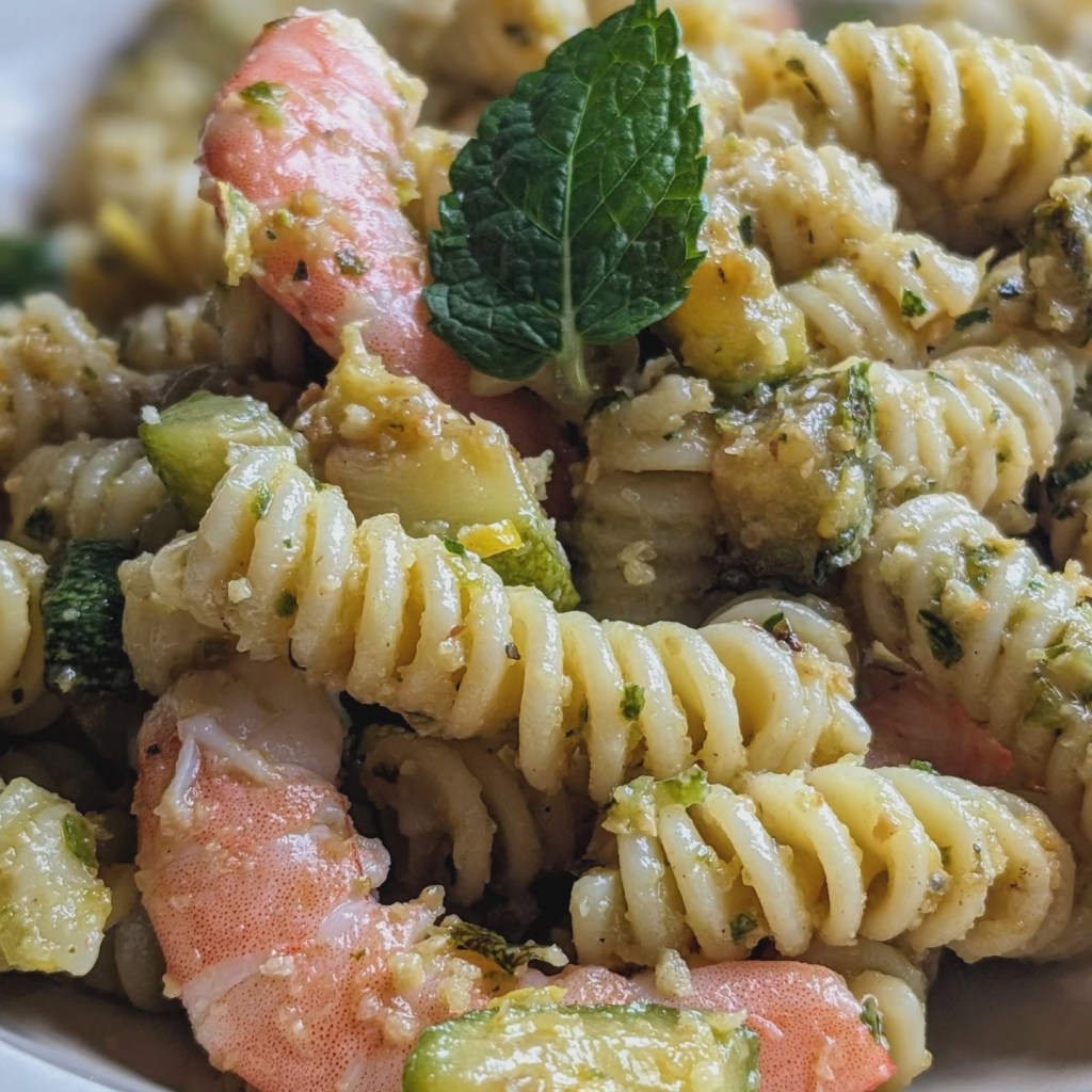 Ingrédients pour 4 personnes : 400 g de penne – 4 courgettes moyennes – 20 g de feuilles de menthe – Quelques feuilles pour décorer – 250 g de crevettes roses décortiquées – 1 gros citron bio -1 gousse d’ail – 3 c. à soupe de chapelure – 4 c. à soupe d’huile d’olive – Sel, poivre.