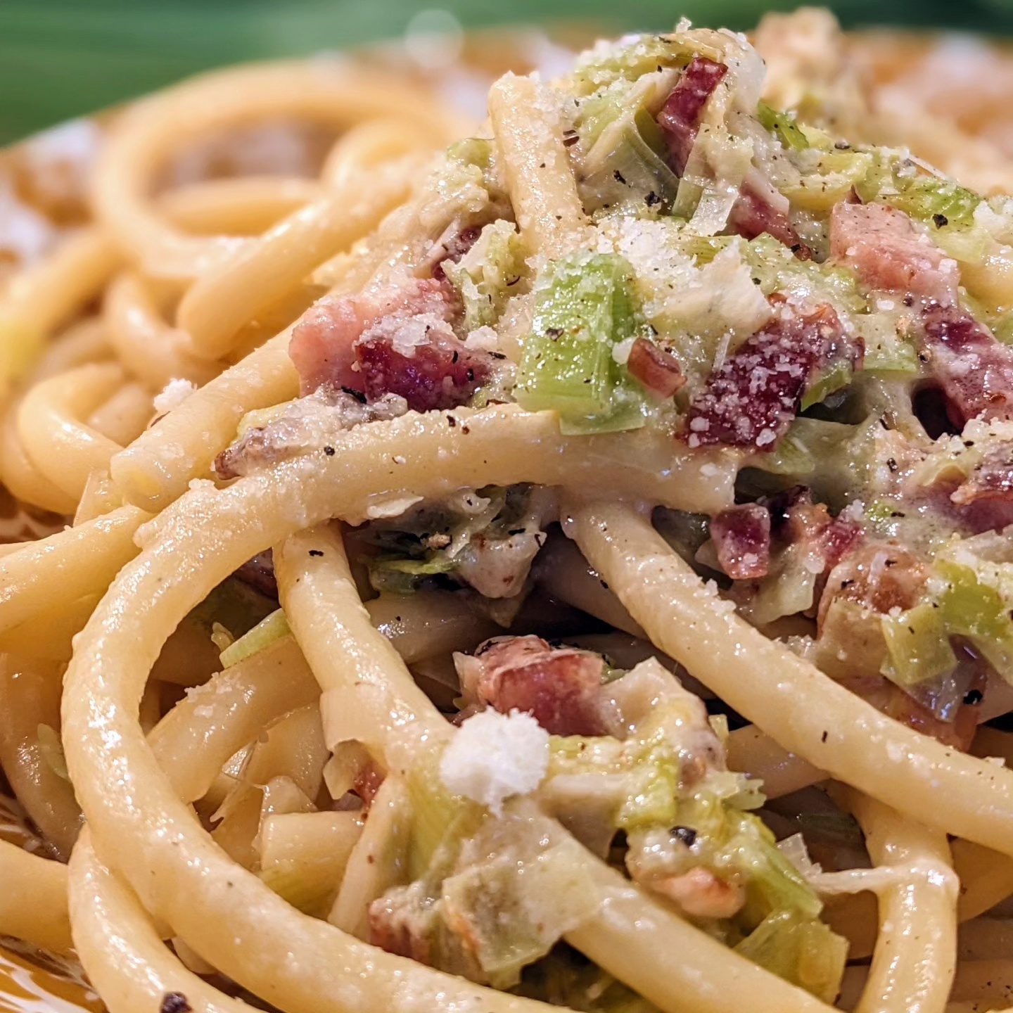 Ingrédients pour 4 personnes : 300 g de talon de jambon blanc – 2 blancs de poireaux – 1 jaune d’oeuf – 125 g de parmesan – 15 g de beurre – 500 g de bucatini 12 cl d’huile d’olive.