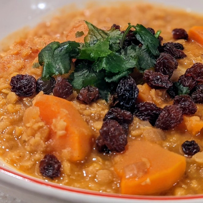 Ingrédients pour 4 personnes : 1 grosse patate douce – 250 de lentilles corail – 1 oignon – 2 cm de gingembre frais – 3 brins de coriandre fraîche – 20 cl de lait de coco – 2 c. à soupe de raisins secs – 1 c. à soupe de concentré de tomate – 1 c. à café de graines de coriandre – 1 c. à café de graines de cumin – 1 c. à café de garam masala – 2 c. à soupe d’huile d’olive – Sel et poivre.