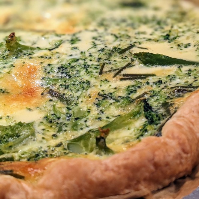 Ingrédients pour 4 personnes : 1 rouleau de pâte brisée – 150 g de beaufort – 500 g de brocoli – 4 brins de ciboulette – 4 oeufs – 25 cl de lait – Sel, poivre.