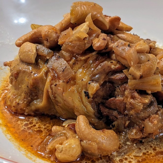 Remettez le poulet dans la cocotte, ajoutez les noix de cajou et couvrez d’eau. Laissez mijoter à feu doux pendant 1h30.