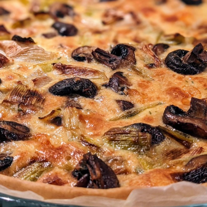 Ingrédients pour 6 personnes : 3 poireaux moyens – 16 champignons de Paris – 1 pâte brisée – 20 cl de crème liquide – 2 oeufs – 50 g de tomme de brebis – 1 pincée de noix de muscade moulue – 2 brins de thym – Huile d’olive