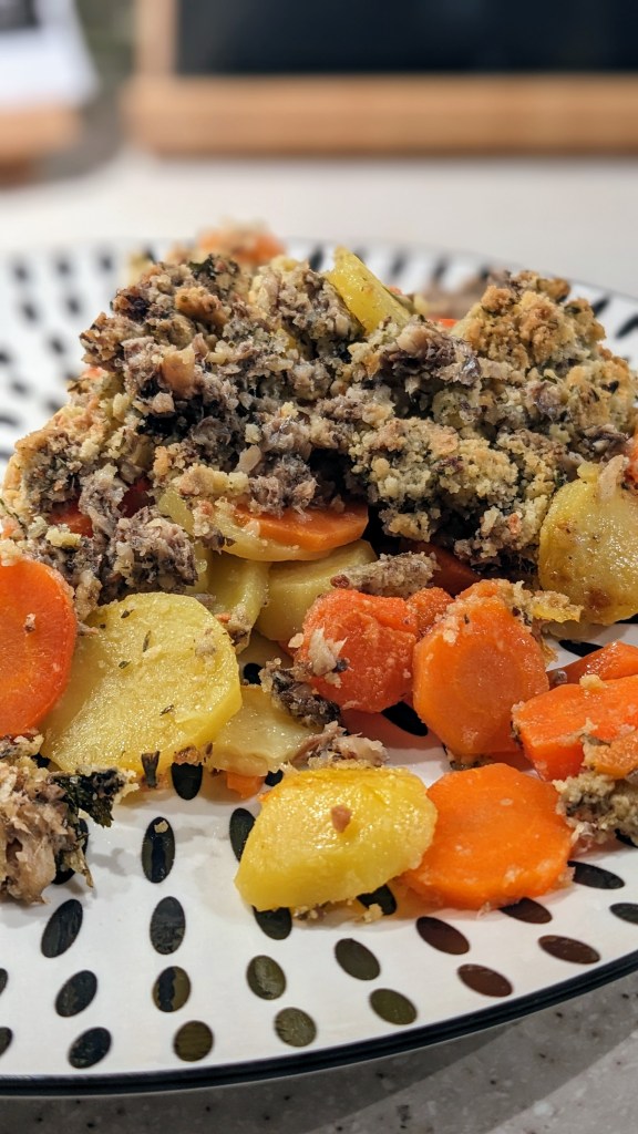 Ingrédients pour 4 personnes : 2 grosses pommes de terre – 4 carottes – Quelques brins de persil frais – 50 g de beurre (+ pour le moule) – 2 boîtes de sardines à l’huile – 100 g de farine – 2 c. à soupe d’Herbes de Provence – 1 c. à soupe d’ail semoule – Sel, poivre.