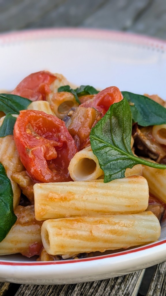 Ingrédients pour 2 personnes : 250 g de rigatoni – 1 aubergine en cubes – 230 g de tomates cerise – 1 tête d’ail coupée – 4 c. à soupe d’huile d’olive – 1 pincée de gros sel – 1 c. à café de piment d’Espelette – 2 c. à soupe de pulpe de tomate – 30 g de parmesan râpé – 50 g de picota – Quelques feuilles de basilic frais – Fleur de sel.