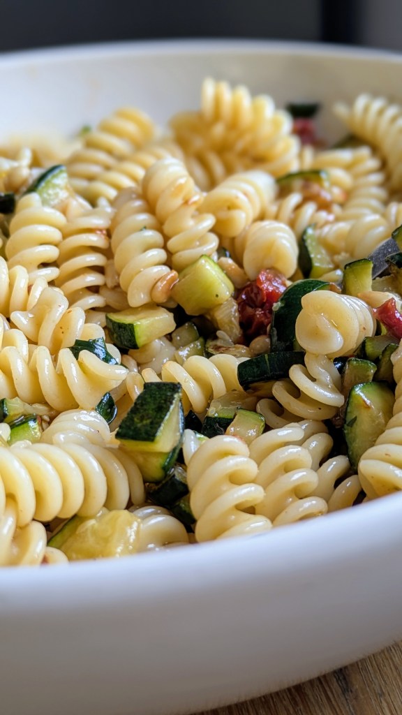 Cette salade est un véritable concentré de saveurs méditerranéennes. Les tomates confites, douces et intenses, se marient à merveille avec la fraîcheur des courgettes, légèrement croquantes. Ajoutez-y des pâtes al dente pour la texture, et vous obtiendrez un plat à la fois gourmand et équilibré