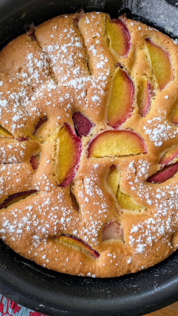 Ingrédients pour 6 personnes : 4 pêches – 3 oeufs – 105 g de beurre – 125 g de farine – 100 g de cassonade – 3 pincées de levure chimique – 3 pincées de vanille en poudre – 1 pincée de sel – extrait d’amandes amères