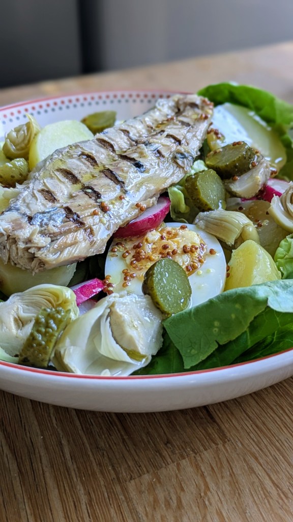 Ingrédients pour 4 personnes : 300 g de pommes de terre – 100 g de salade verte au choix – Quelques radis roses – 1 oignon rouge – 2 oeufs – 2 boites de maquereaux marinés – 120 g de coeurs d’artichaut – Moutarde à l’ancienne – 4 cornichons coupés en rondelles – Vinaigre de cidre – Huile – Sel.